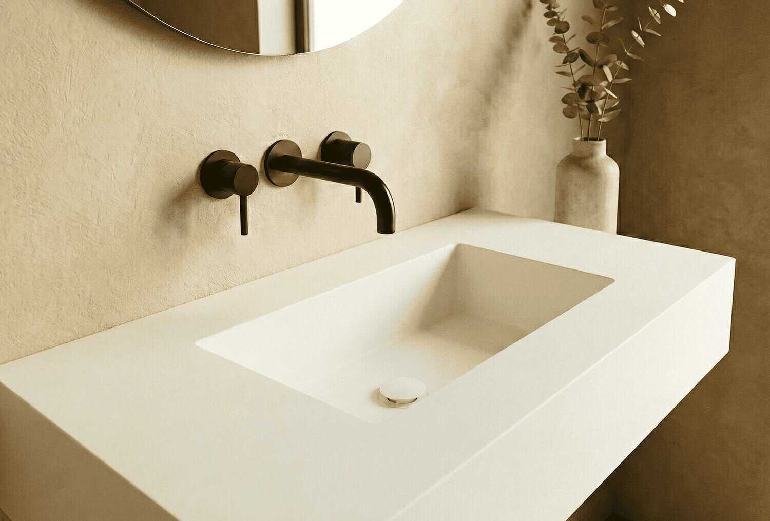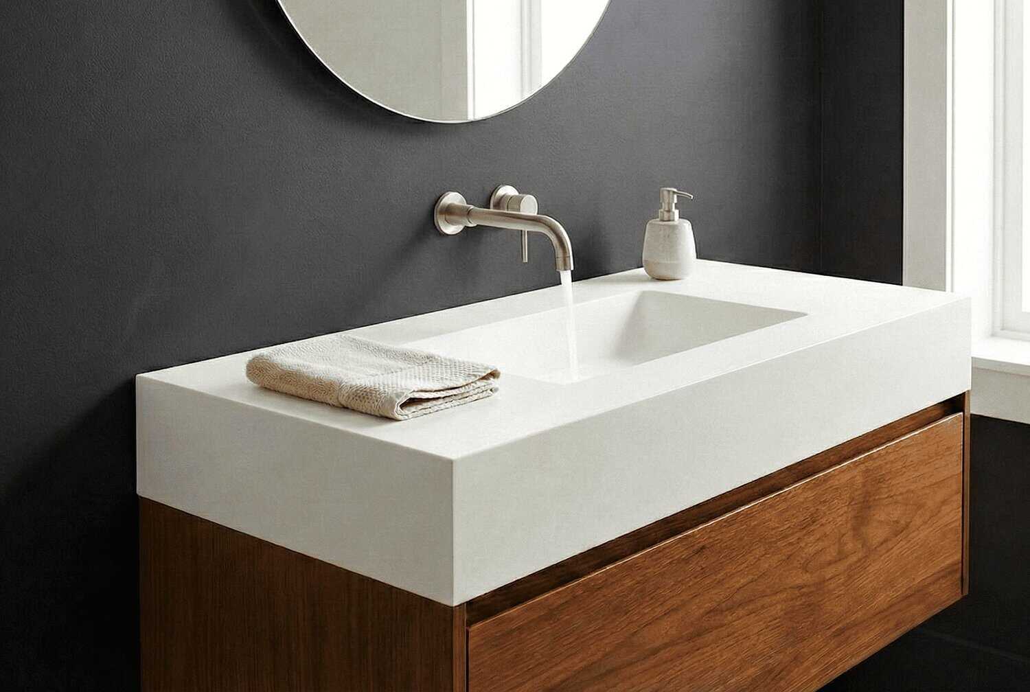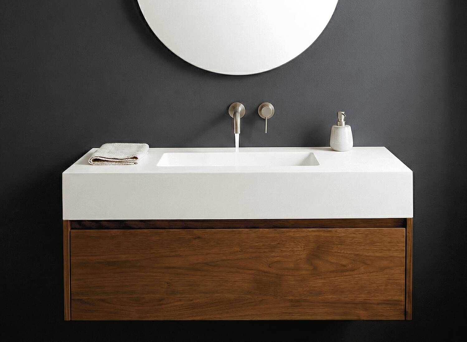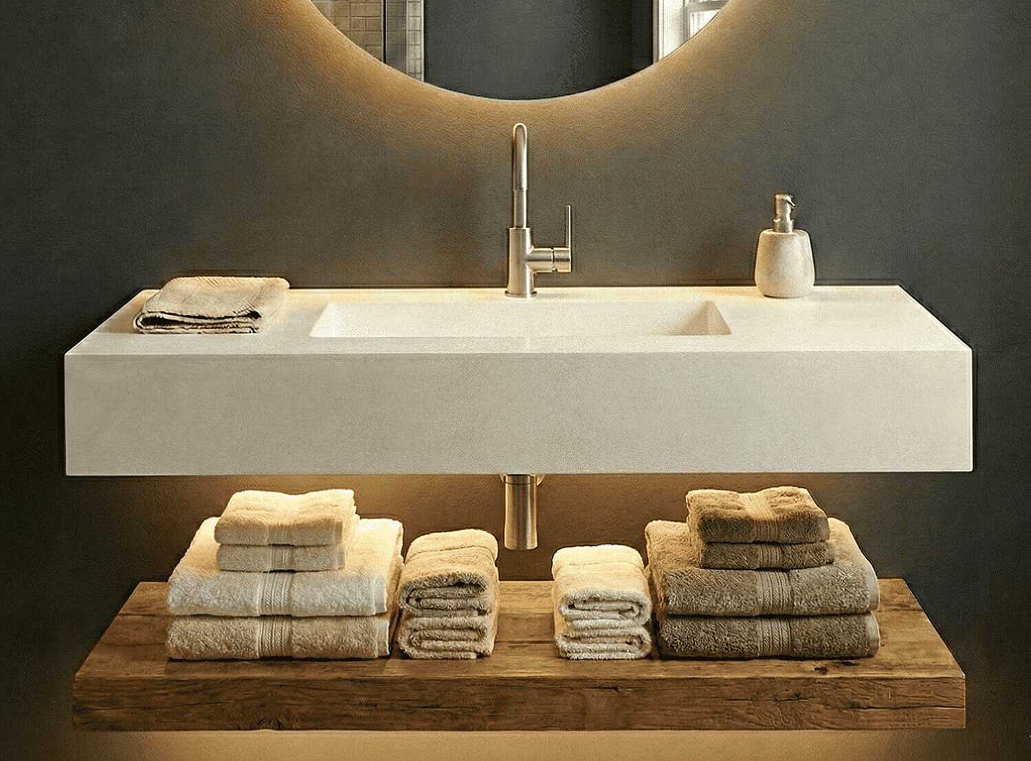 Customizable suspended countertop. It is made entirely of Solid Surface, an exclusive and modern material whose main characteristics are: