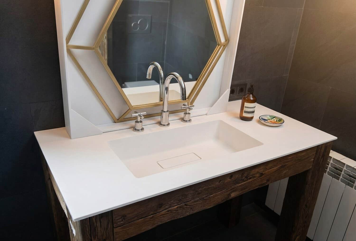 Esta encimera de lavabo modelo Tape M está realizada enteramente en Solid Surface color blanco, un material exclusivo y moderno cuyas principales características son: