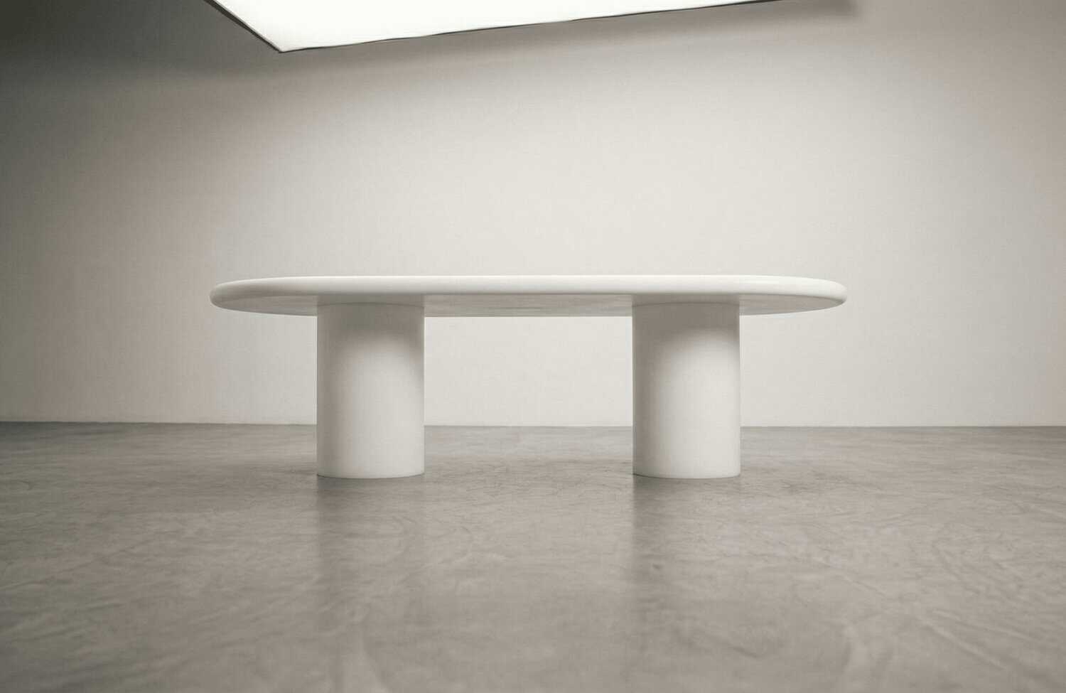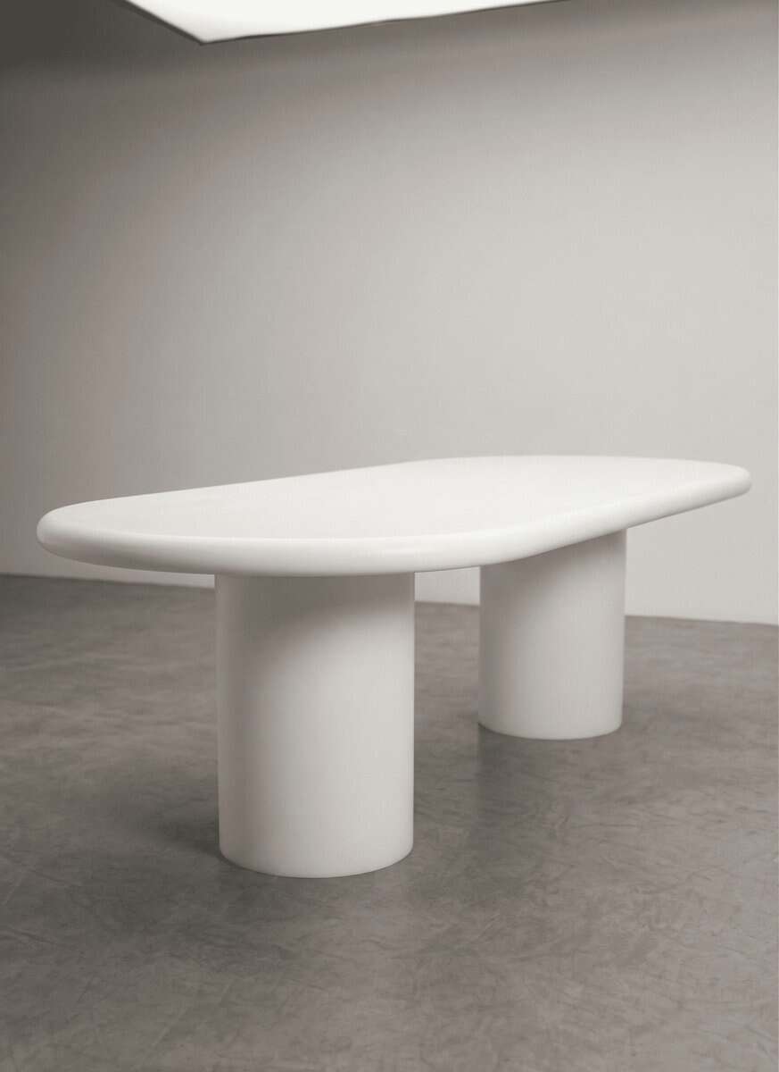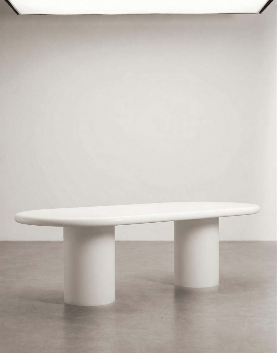 La arquitectura de la mesa se apoya sobre dos patas cilíndricas de 40 cm de diámetro, una medida estudiada para ofrecer un equilibrio visual perfecto y una base sólida que no compromete la comodidad de los comensales. El sobre ovalado permite una circulación fluida en la estancia, eliminando las esquinas agresivas y fomentando la conversación.