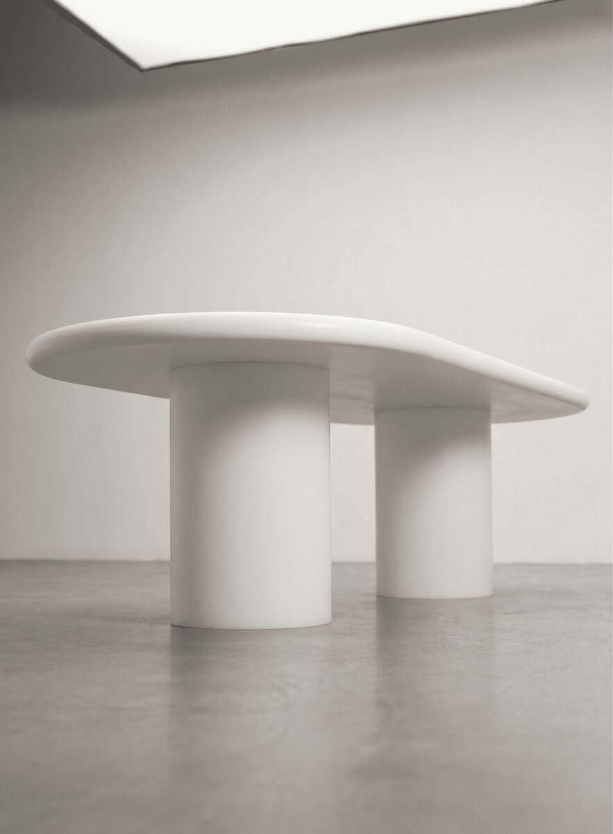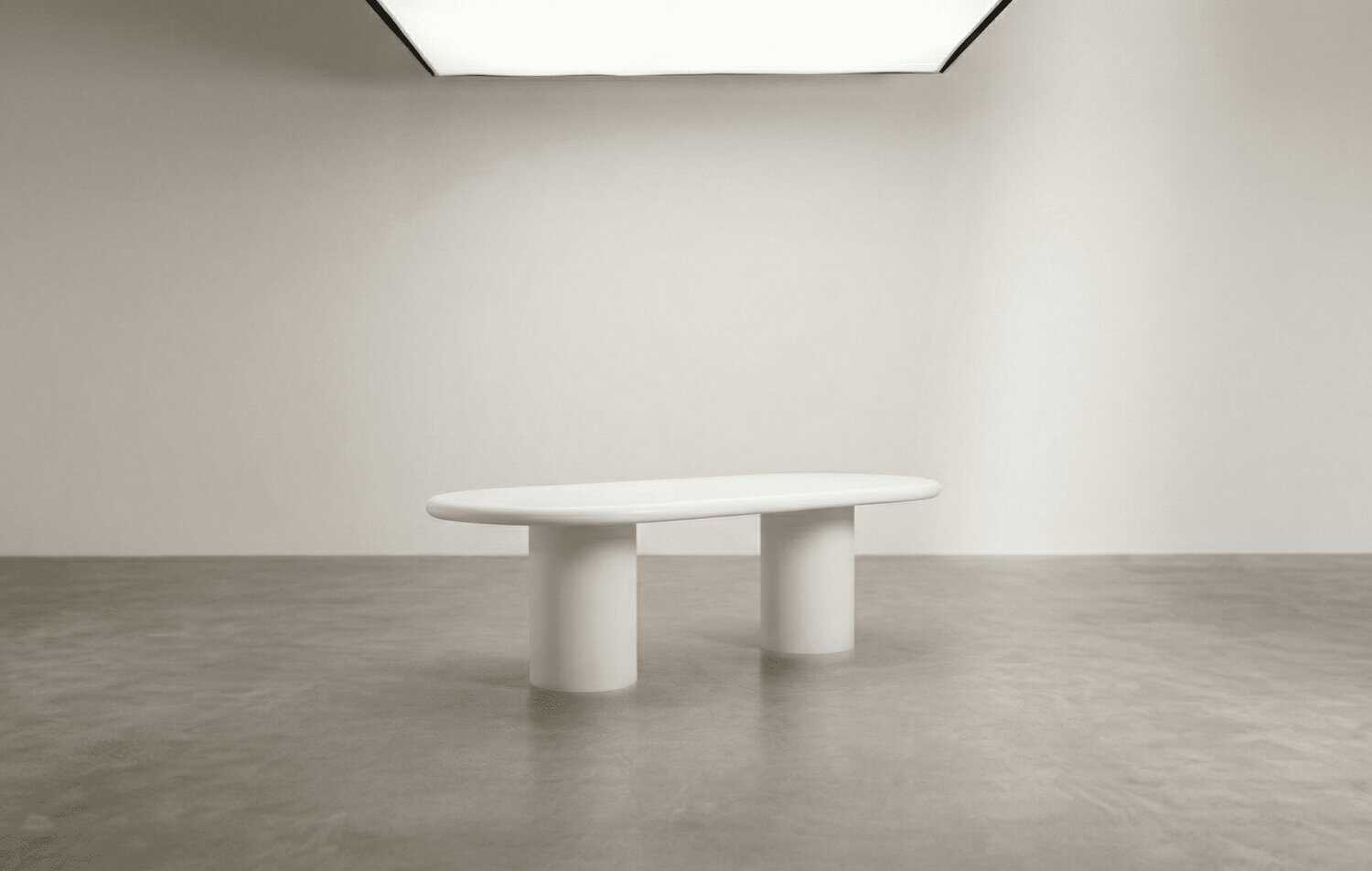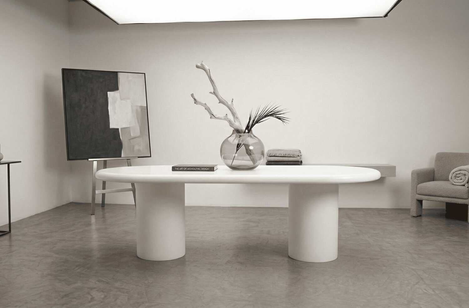 La arquitectura de la mesa se apoya sobre dos patas cilíndricas de 40 cm de diámetro, una medida estudiada para ofrecer un equilibrio visual perfecto y una base sólida que no compromete la comodidad de los comensales. El sobre ovalado permite una circulación fluida en la estancia, eliminando las esquinas agresivas y fomentando la conversación.