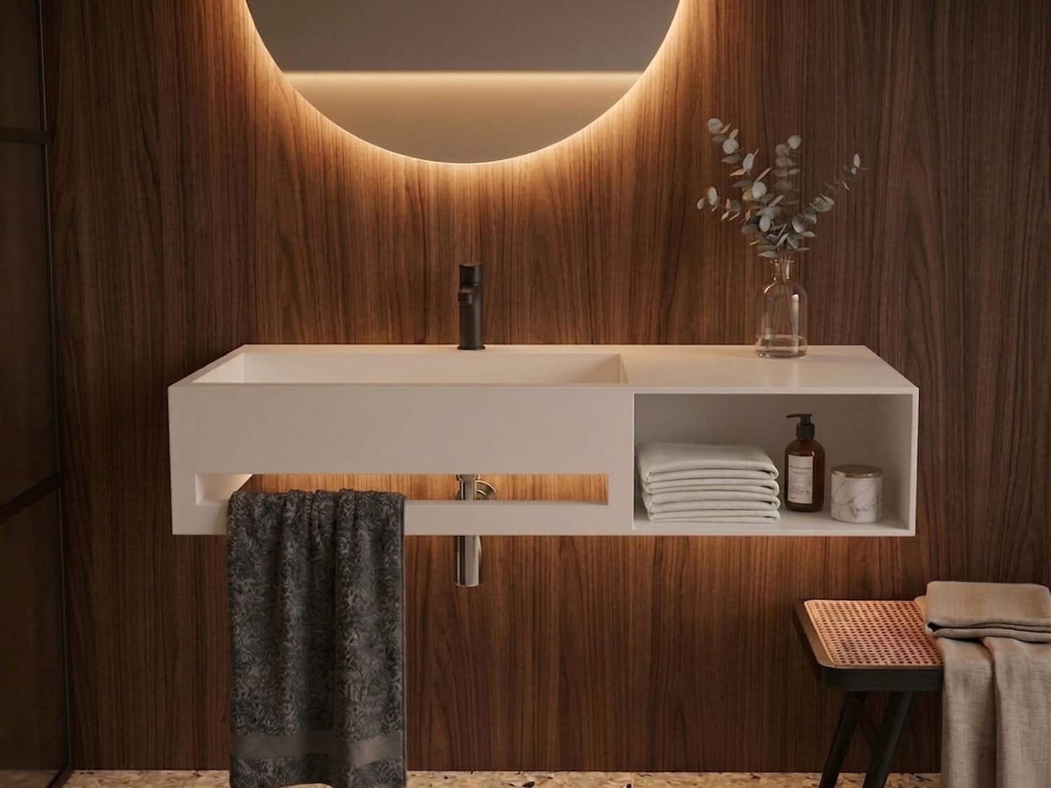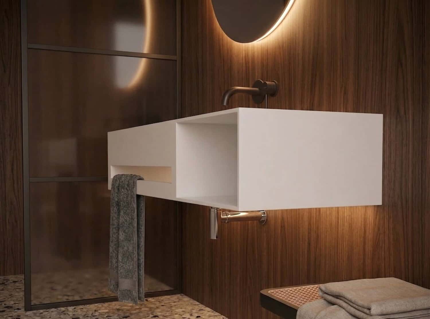 Con envío gratuitoLavabo suspendido Corian® Glacier White 12mm – Elegancia personalizable y fácil montaje